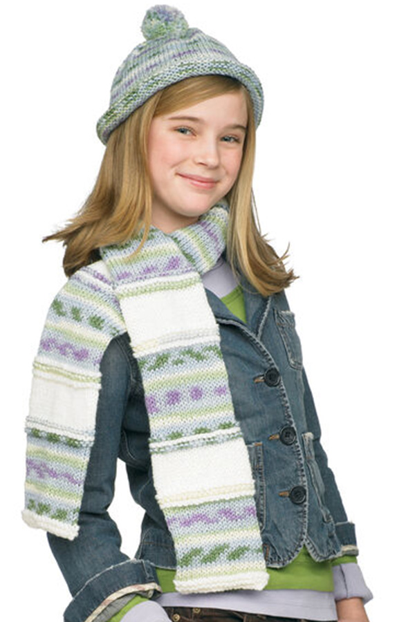 Easy to knit this attractive hat and scarf set combines Red Heart multi-colors with coordinating solids.